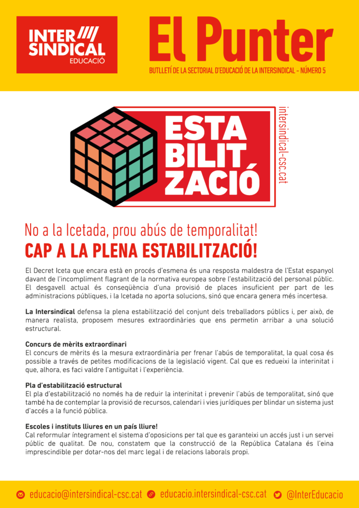 Per això, des de la Intersindical diem prou d’excuses i reclamem l’esmentat augment pressupostari, perquè cal que la contribució que fan els ciutadans d’aquest país en impostos i taxes es vegi reflectida en l’exercici del dret a l’educació.