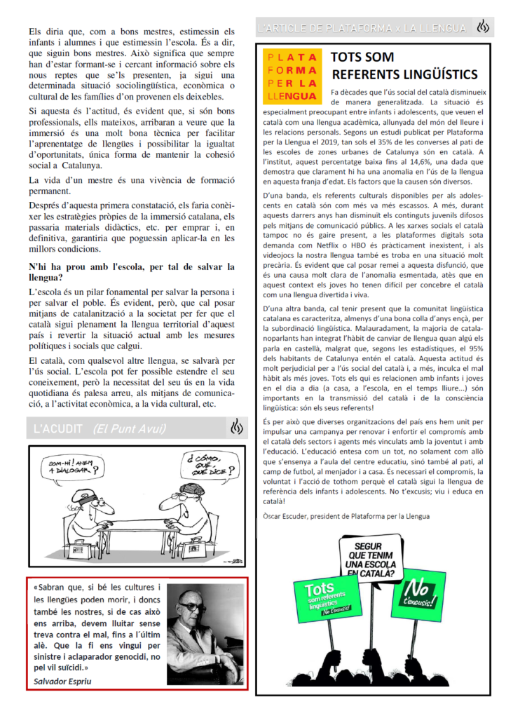 A més, la normativa pel que fa a l’ús del català a l’educació és clara, i no s’està complint. Aplicar les normatives en matèria lingüística ha estat una assignatura pendent a l’educació i en altres àmbits dels successius governs de la Generalitat. Al sindicat rebem queixes lingüístiques i actuem per resoldre-les i restablir la normalitat als centres, i és per això que estem en procés d’oferir una nova eina a tota la comunitat educativa: una bústia de queixes lingüístiques que ens permetrà animar la gent a assenyalar mancances i incompliments, i que oferirà una via efectiva per conèixer la normativa vigent i activar, des del sindicat, tots els mecanismes necessaris per solucionar el problema.