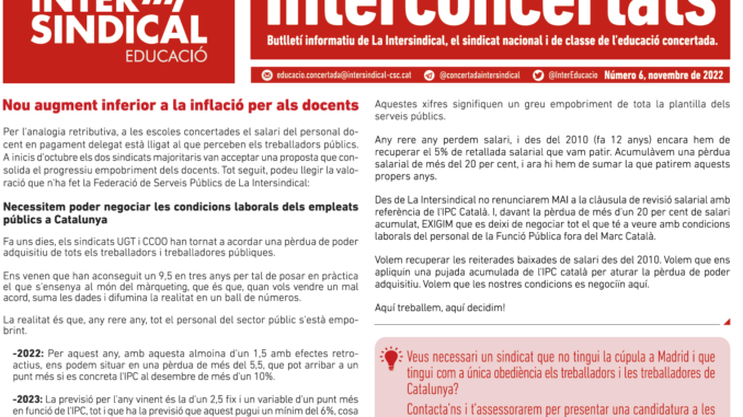 Al nou número d’Interconcertats, entre d’altres notícies, hi trobareu el detall sobre l’augment salarial que percebrà el professorat dels cursos concertats, així com la denúncia de la seva insuficiència i de la precarització que suposa per als treballadors del PAS que el seus sous segueixin congelats.