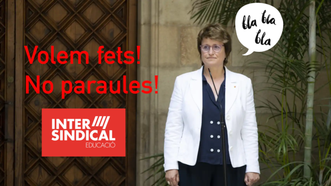 Si bé és cert que s’han acabat els precaris terços de jornada, i s’ha restablert l’horari lectiu anterior a les retallades, aquests són els únics dos punts que han complert d’aquell llistat de quinze sobre el qual havíem de treballar: ni reducció de ràtios suficient (la reducció és marginal, i només afecta I3 i I4), ni cap tancament a l’escola pública, ni s’ha aturat la persecució judicial contra el català, ni equiparació salarial a FP, ni currículums consensuats, ni reversió al calendari anterior, ni dues hores lectives de reducció per als majors de 55 anys, ni sexennis de 6 anys, ni retorn del deute, ni recuperació de poder adquisitiu, ni el personal necessari per a fer efectiva l’escola inclusiva, etc. Podríem estendre’ns unes quantes línies més.