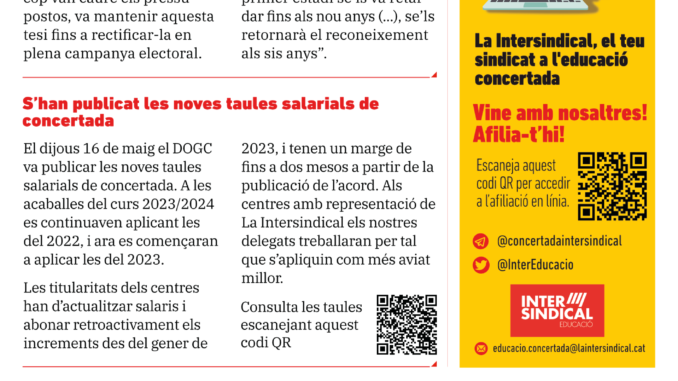 El DOGC ha publicat les noves taules salarials de la concertada, que començaran a aplicar-se des del 2023. Les titularitats dels centres han d’actualitzar els salaris i abonar retroactivament els increments des de gener de 2023. La Intersindical treballarà per assegurar que aquesta aplicació es faci com més aviat millor. Podeu consultar les taules a l’apartat de concertada del nostre web.