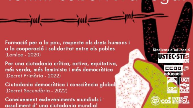 Davant les recents pressions d’algunes direccions escolars cap als docents que participen en la campanya de samarretes solidàries amb Palestina, La Intersindical volem deixar clar que la participació en aquesta iniciativa té una plena cobertura legal. La normativa educativa actual, com per exemple la LOMLOE (2020) o els decrets de primària i secundària del 2022, estableix clarament que la formació per a la pau, el respecte als drets humans i la cooperació entre els pobles són part essencial de l’educació. Per tant, accions com la campanya de suport a Palestina estan plenament justificades dins del marc legal.