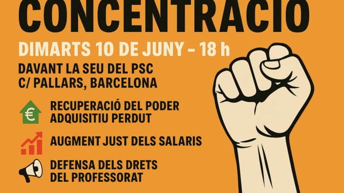 La Intersindical hem acordat amb La Plataforma Docents en Vaga i altres organitzacions sindicals una nova estratègia conjunta de mobilització per combatre l’empobriment del col·lectiu docent i exigir millores reals. Ens posem en marxa amb una primera convocatòria: concentració el dimarts 10 de juny a les 18 h davant la seu del PSC (Carrer Pallars, Barcelona).