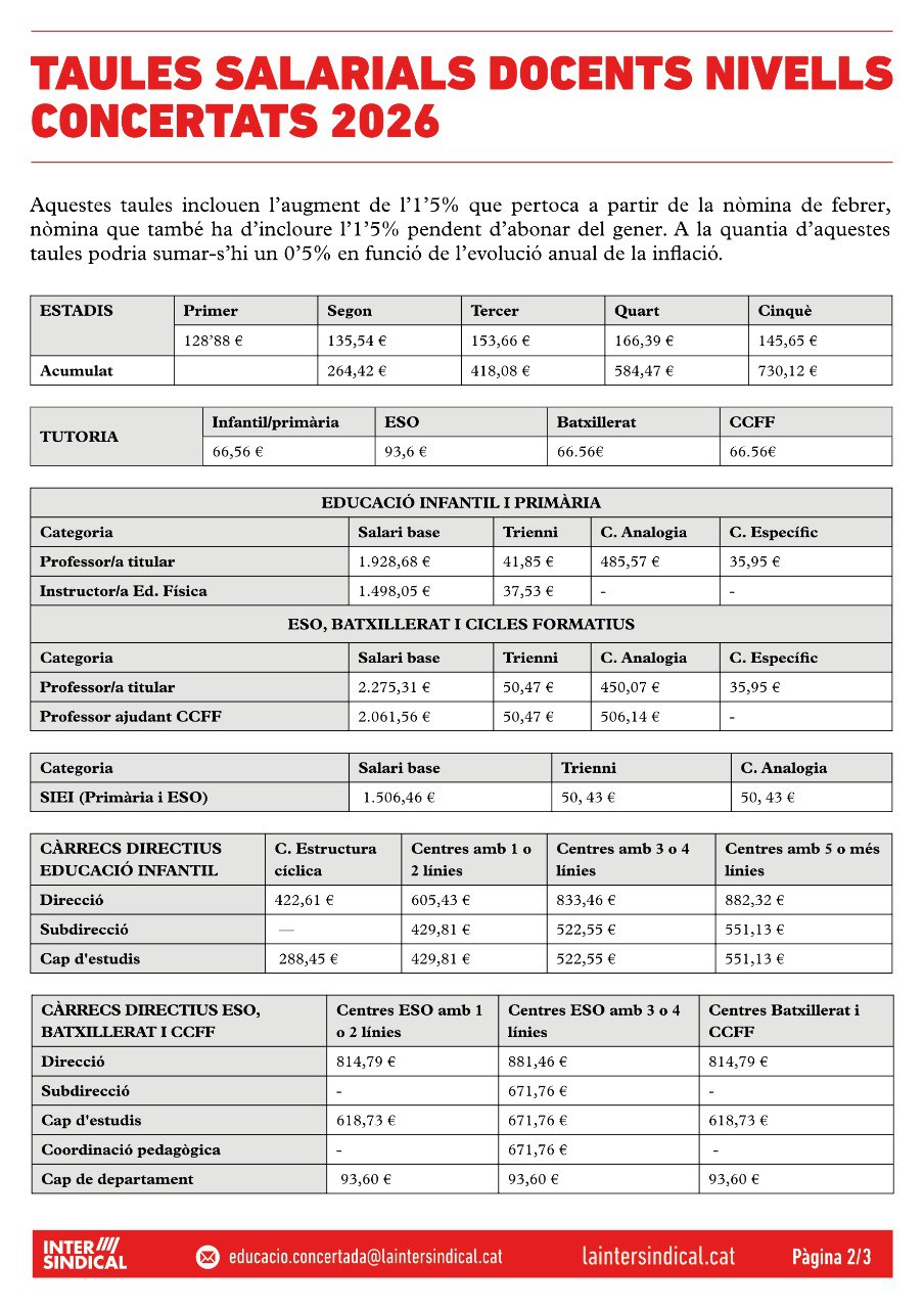D’una banda, el número de L’Interconcertats de març examina detalladament les noves taules salarials. Analitzem com s’han d’aplicar al professorat dels nivells concertats i quin impacte real tenen sobre les nostres nòmines. La Intersindical considerem que cal una vigilància estricta per garantir que no es perdi ni un euro de poder adquisitiu.