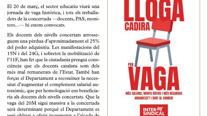 De l’altra, dediquem un espai central a la convocatòria de vaga impulsada per reclamar millores laborals urgents. La Intersindical exigim augments salarials dignes i l’equiparació de la jornada lectiva amb la de l’ensenyament públic. No podem permetre que els treballadors de la concertada continuem en una situació d’inferioritat greu.
